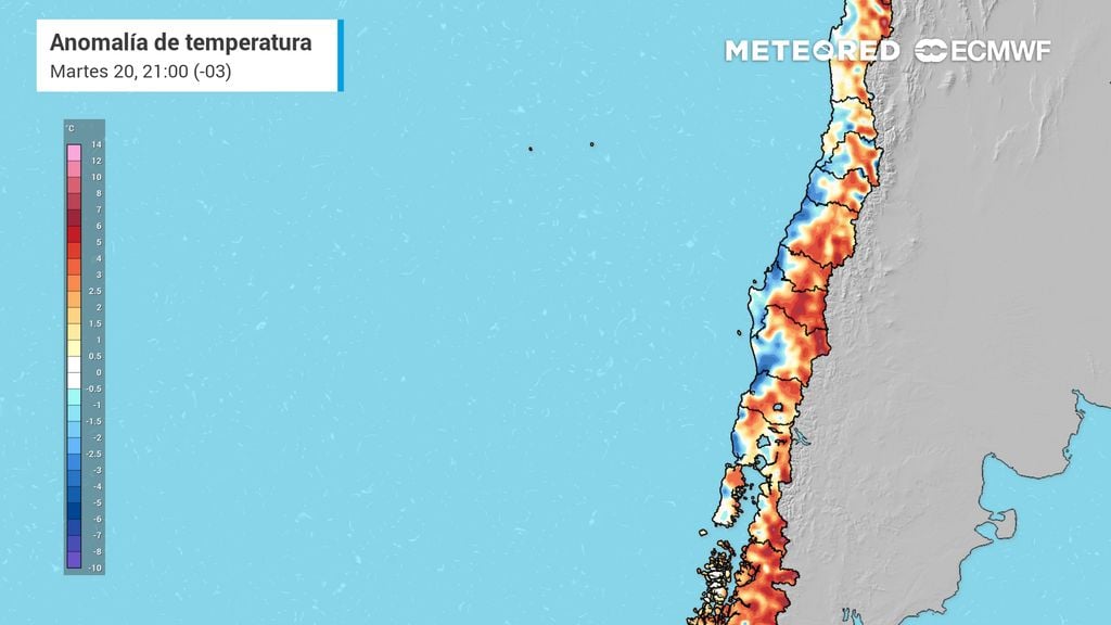 De acuerdo con el modelo europeo ECMWF, en el centro de Santiago las temperaturas máximas se moverán entre los 29 y 32 °C, configurando una baja térmica significativa tras varios días de calor extremo. Este descenso marcará el fin del actual episodio de altas temperaturas en la capital.
