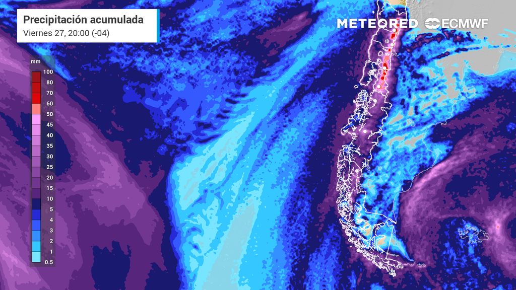 Entre la madrugada y el mediodía del viernes 27 de junio, las lluvias continuarían entre las regiones de La Araucanía y Aysén para comenzar a declinar.