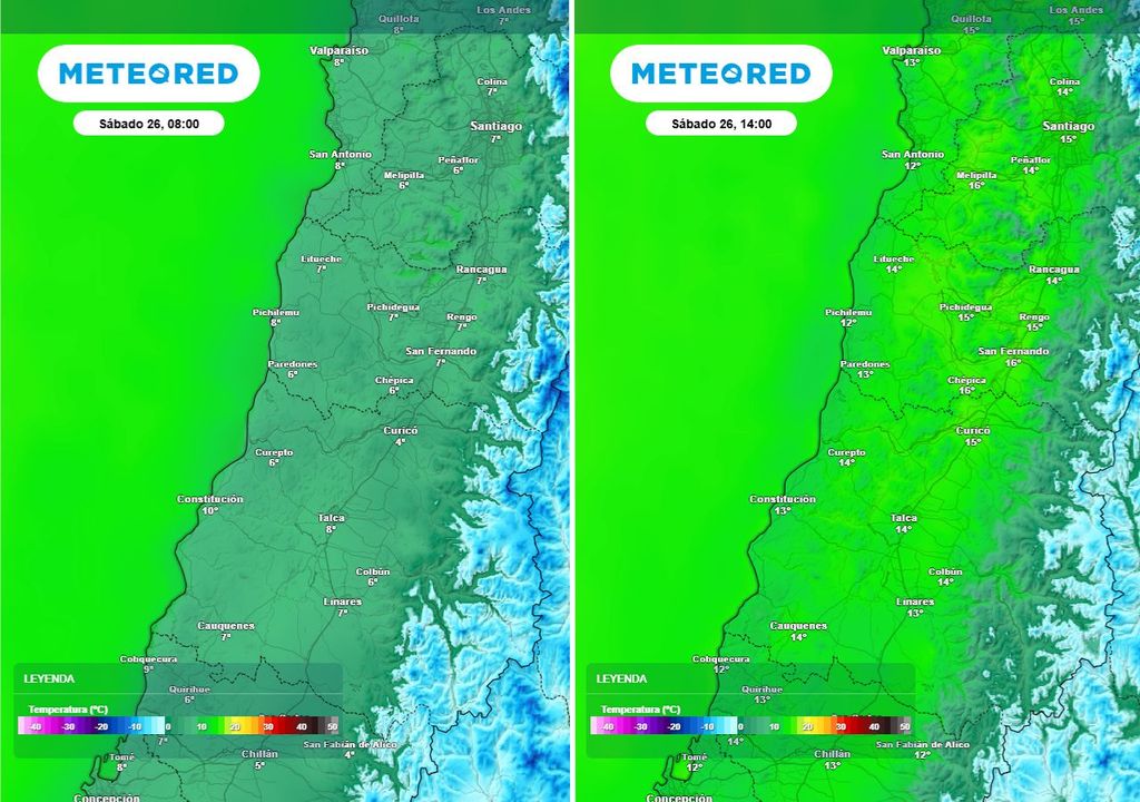 Las temperaturas mínimas serán frías, particularmente en sectores interiores como Los Andes (mínimas de 4 °C) y Rancagua (mínimas de 4 a 6 °C), mientras que las máximas oscilarán entre los 14 y 16 °C. En la costa, como en San Antonio, Pichilemu y Concepción, las temperaturas tendrán menor oscilación, moviéndose entre los 9 y 16 °C, con sensación térmica más baja debido al viento.