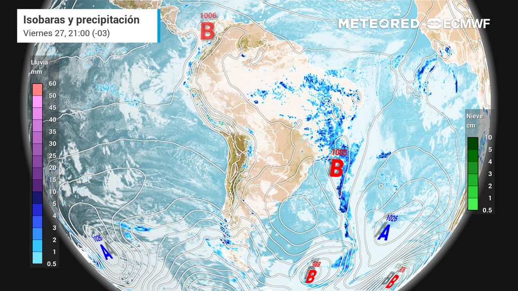 El frente frío asociado a este sistema se extiende de manera considerable hacia el norte, proyectando precipitaciones hasta Ñuble y Biobío durante el fin de semana.