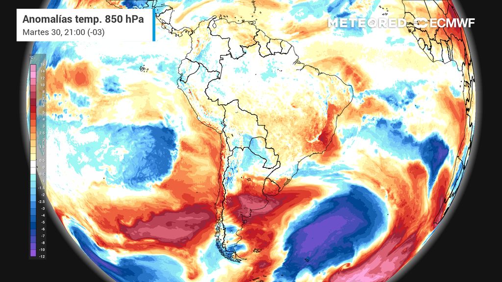 El modelo europeo ECMWF proyecta un escenario de temperaturas progresivamente elevadas. Durante el lunes 29 de diciembre, las primeras señales del calor intenso se harán presentes con máximas de 34°C en Santiago y Los Andes, 33°C en Rancagua, y valores aún más altos hacia el sur, alcanzando los 36°C en Talca y 35°C en Chillán.