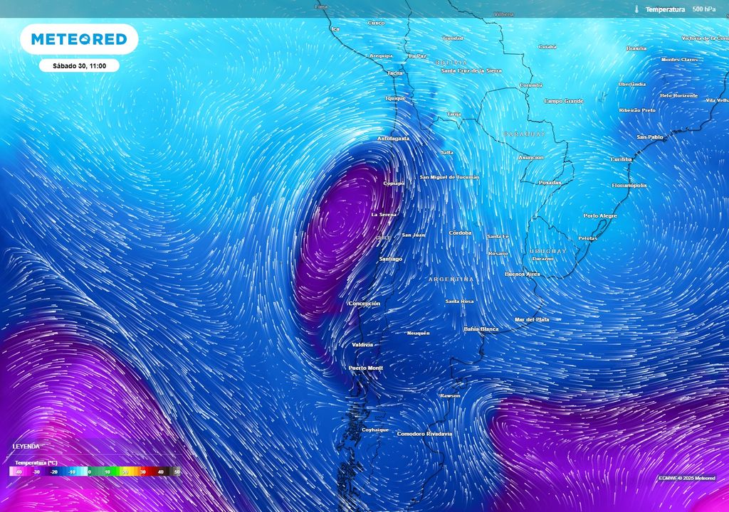 El núcleo frío que se desprenderá de una vaguada de altura alcanzará el norte del país durante el día sábado (30). En su parte más norte, su actividad recaerá en sectores de la cordillera de Atacama, donde se esperan nuevos chubascos de nieve.