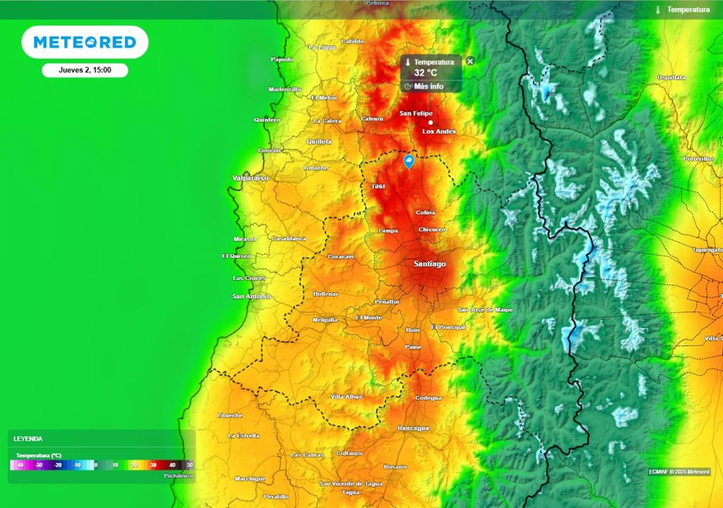 El viernes 03 continuará con un panorama similar, aunque ya se percibirá un ligero descenso de temperaturas en sectores como Santiago y Rancagua. Aun así, predominarán las condiciones estables, con cielos despejados y temperaturas cálidas en los valles.