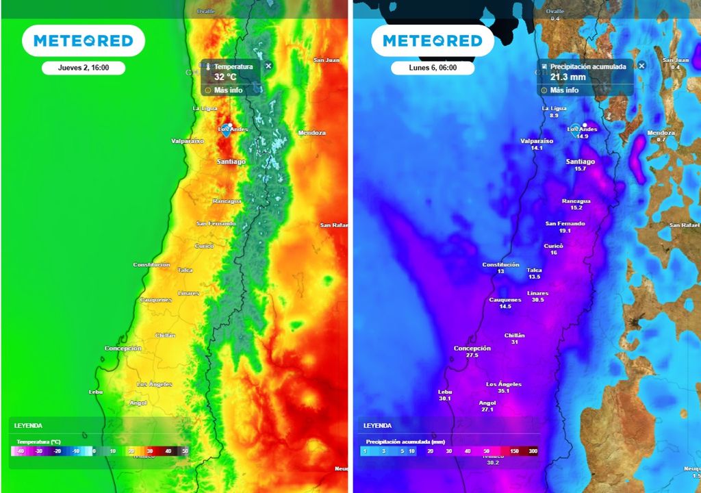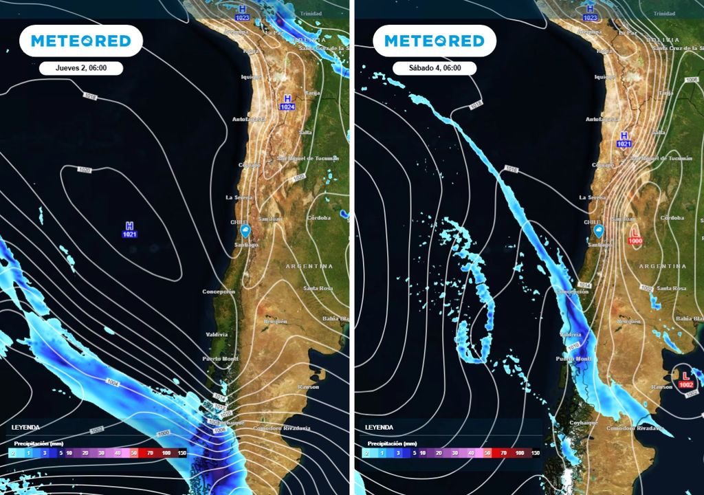 El cambio se hará evidente desde el sábado 04. El avance de un frente frío desde el sur comenzará a modificar el patrón atmosférico. En Los Andes y Santiago, las precipitaciones se manifestarán en la tarde-noche, con acumulados débiles de entre 1 y 2 mm. Rancagua registrará alrededor de 4 mm, mientras que en Curicó y Talca se esperan montos más relevantes, cercanos a los 8 mm.