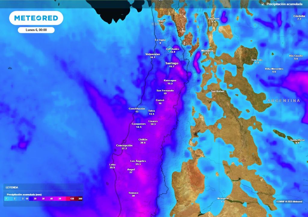 El domingo 05 será la jornada más inestable y lluviosa, con precipitaciones más generalizadas y significativas. Santiago podría acumular cerca de 9 mm, mientras que Rancagua alcanzaría 8.7 mm.
