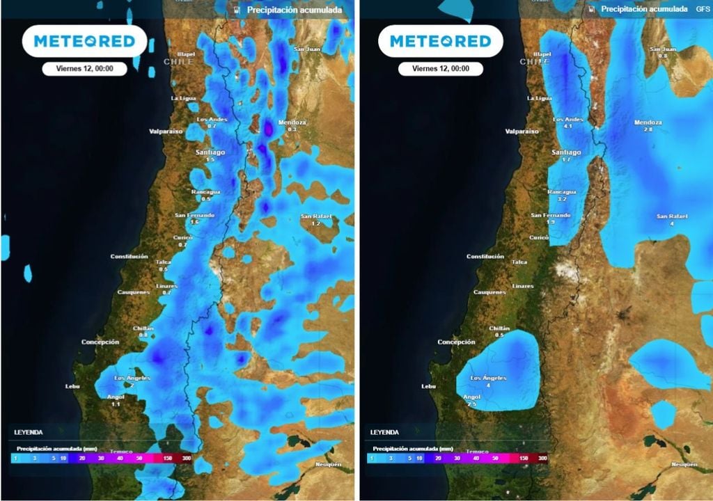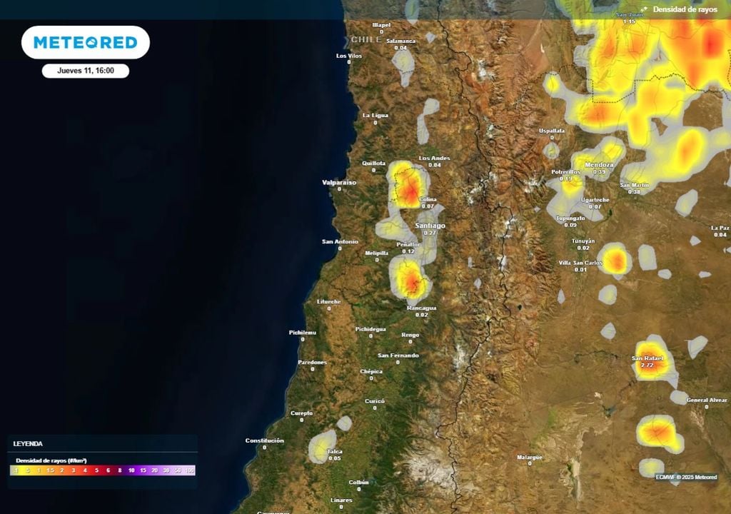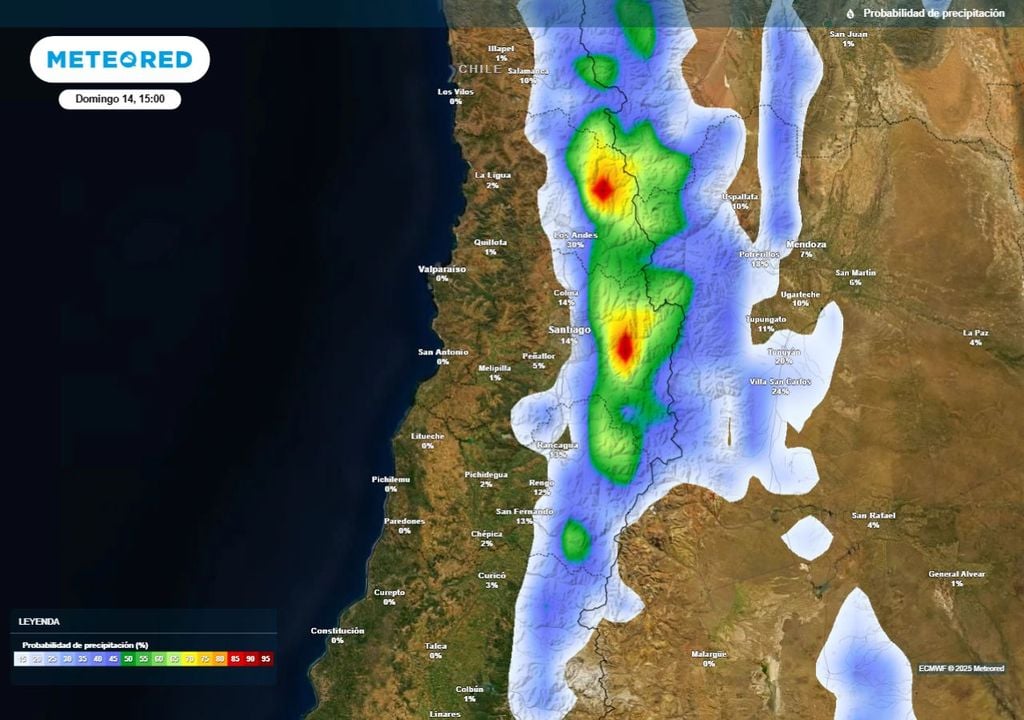 Santiago enfrentará un 60% de probabilidad de lluvia débil con acumulados cercanos a 0.8 mm y posibilidad de tormentas eléctricas, mientras que situación similar se presentará en Rancagua (50% de probabilidad, 0.6 mm) y Los Andes (50% de probabilidad, 0.4 mm).