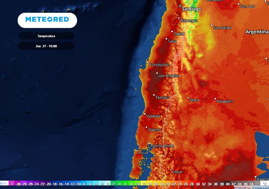 Si bien el periodo más intenso de las altas temperaturas se espera durante el mismo jueves, con valores que pueden superar los 34 a 36 grados en el interior de las regiones del Maule a Los Ríos, las altas temperaturas no pasarán desapercibidas en la Patagonia, superando los 26 grados en la Región de Aysén durante el viernes (28) y, de continuar esta misma tendencia por parte del modelo del ECMWF, también el sábado (29).