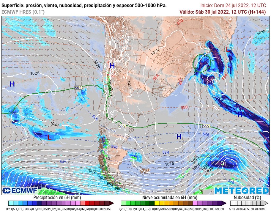 En los próximos días continuaremos acompañando este sistema. A mediados de esta última semana del mes tendremos la seguridad de si la predicción del modelo del ECMWF nos apuntará hacia un "adiós" a julio con lluvias o sin lluvias, en el centro norte de Chile.