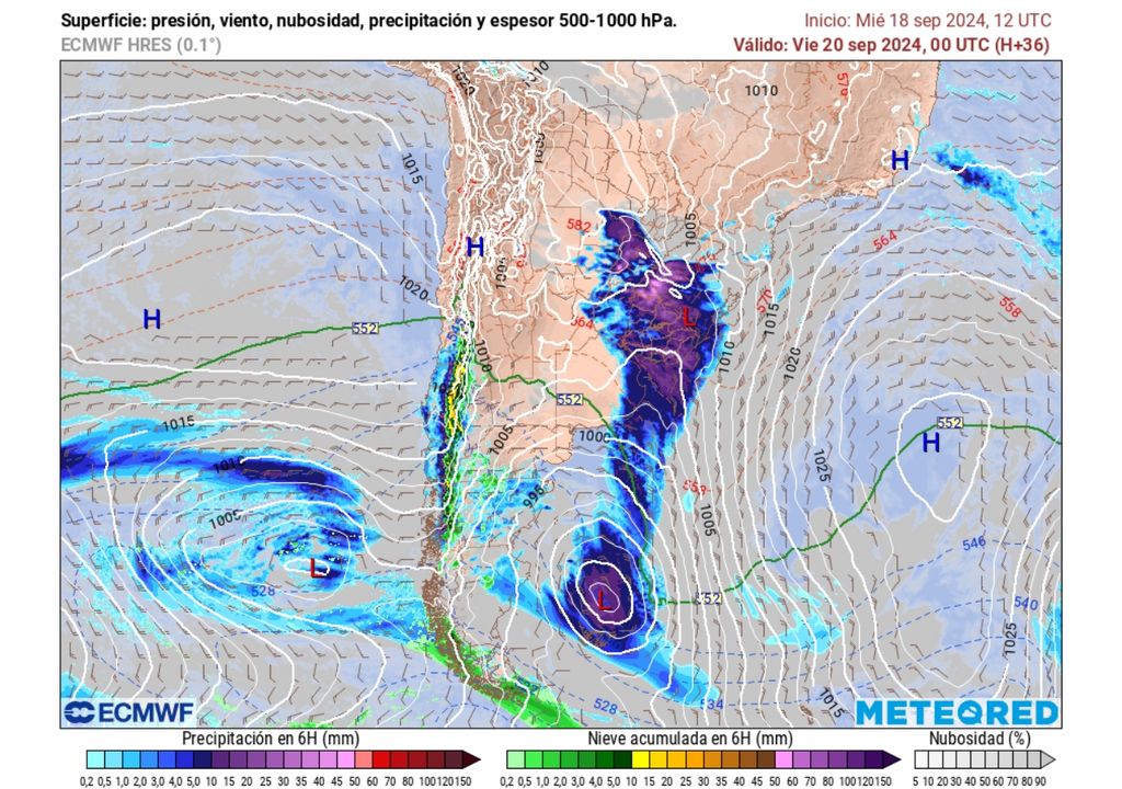 Y así como en la cueca, llegará una tercera patita del lluvias al país para encerrar las Fiestas Patrias. El modelo del ECMWF prevé el desarrollo de una baja presión en el área oceánica durante el sábado, la que avanzaría hacia Chile llegando el domingo (22).
