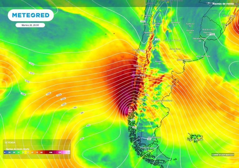 El sistema frontal, rápido y furioso, llegará con vientos de más de 100 km/h al sur del país. Además, el aporte de humedad de un río atmosférico dejará abundantes precipitaciones en cortos periodos de tiempo.